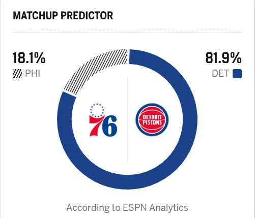 赛前,美媒ESPN预测本场比赛,活塞胜率81.9%,76人胜率18.1%。